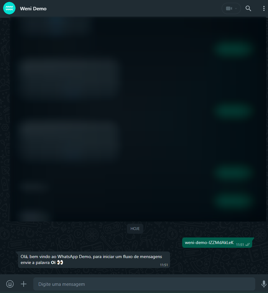 - El campo de envío de mensajes tendrá el código único de tu bot Demo. Presiona Enter y tu bot será activado.