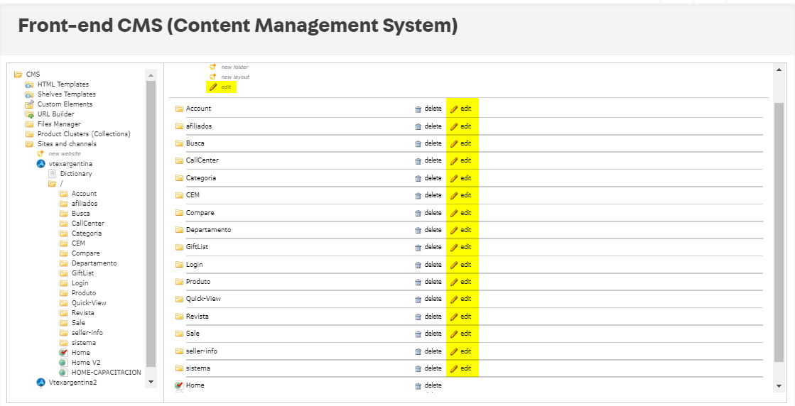 - En el Admin VTEX, accede a **Storefront > ** y abra la carpeta CMS;