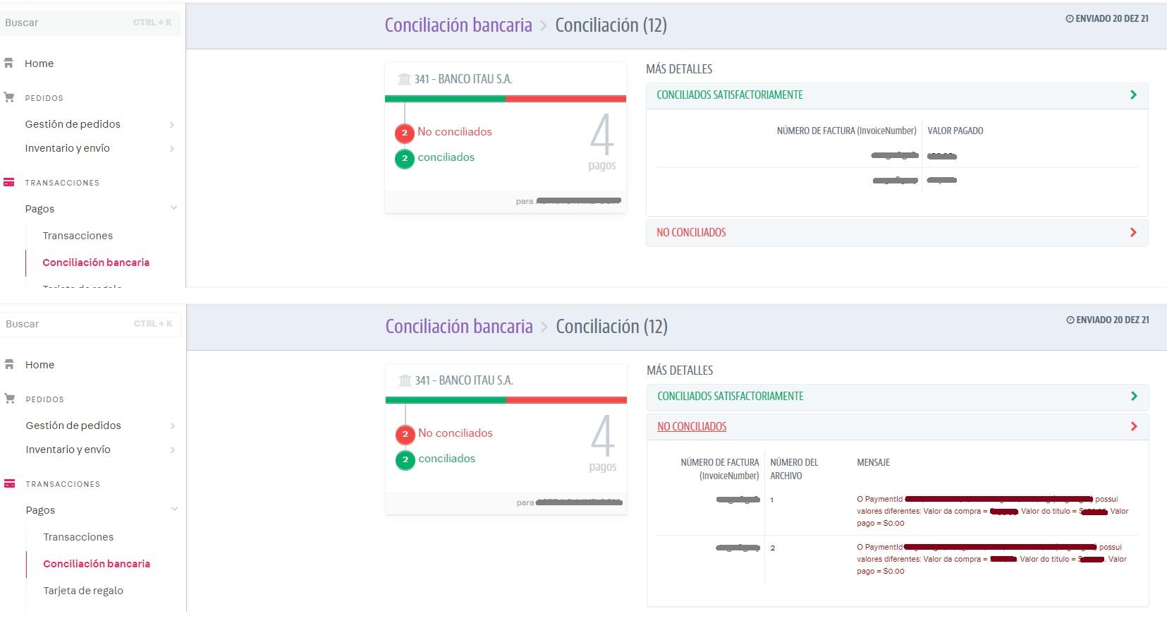 3. En Más detalles, haga clic en Conciliado Satisfactoriamente o No conciliados para verificar los detalles de las transacciones realizadas en un banco en particular.