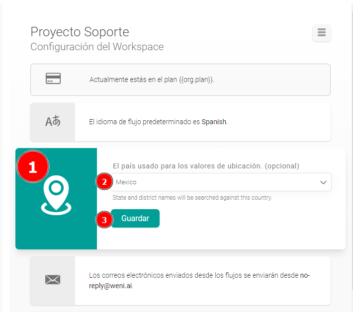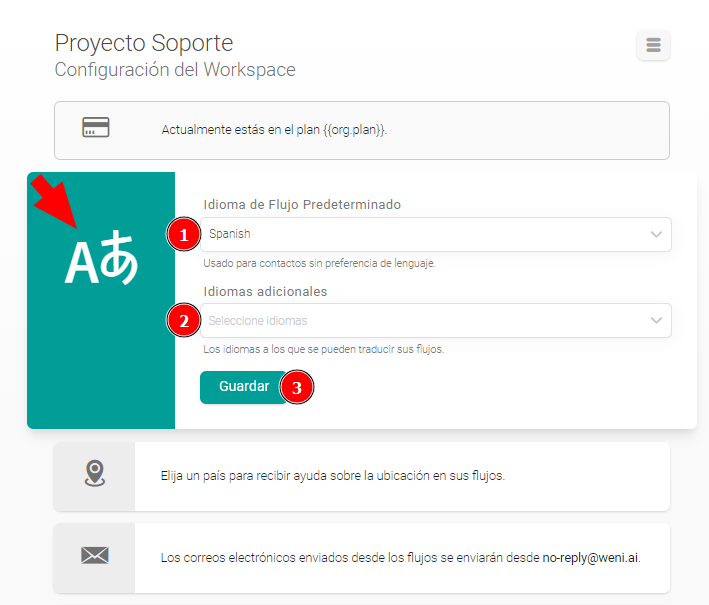 Aquí podrá configurar dos o más idiomas para su organización: uno principal (utilizado por defecto en los flujos) y otros secundarios (definidos al crear el flujo).