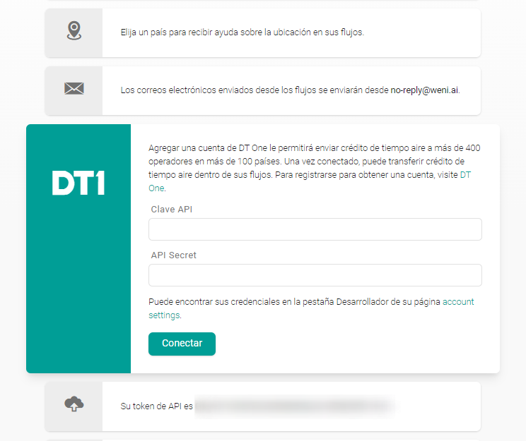 Aquí podrá verificar el token de su API. El token es la clave de acceso para que aplicaciones externas puedan interactuar con la API de la Plataforma Weni.