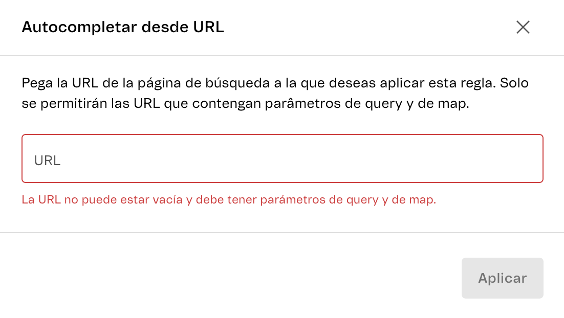 Haz clic en Autocompletar desde URL para agregar la URL de la página de búsqueda donde se aplicarán las reglas de activación.