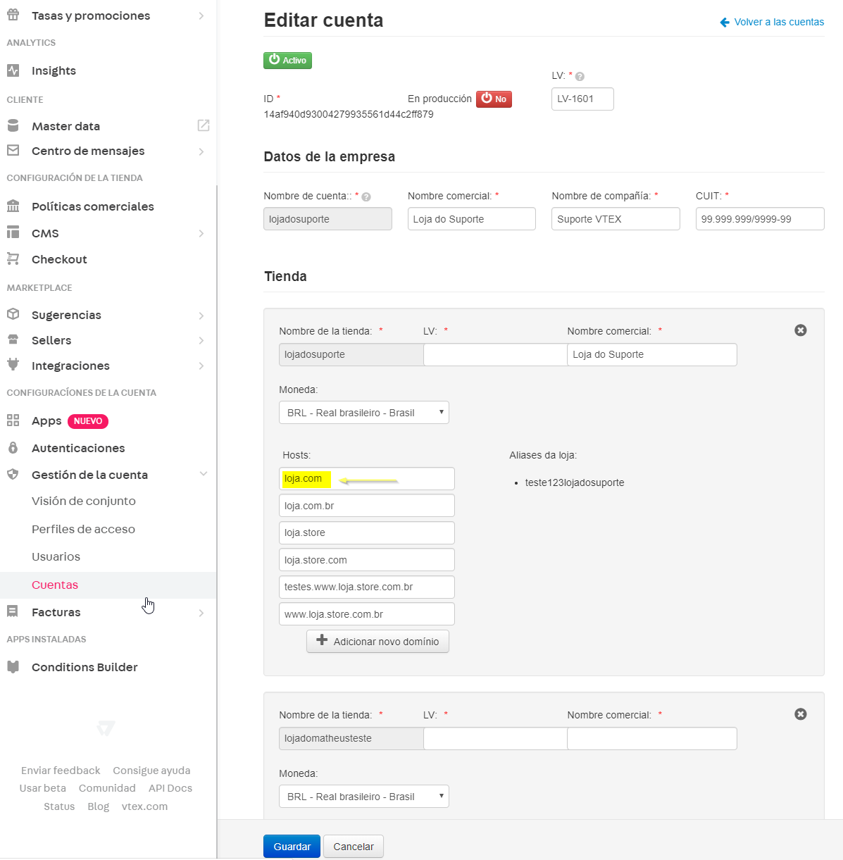 - Tienda: complete con el nombre de la cuenta, que se puede encontrar en Configuraciones de la Cuenta > Gestión de la Cuenta > Cuentas > Nombre de la Cuenta.