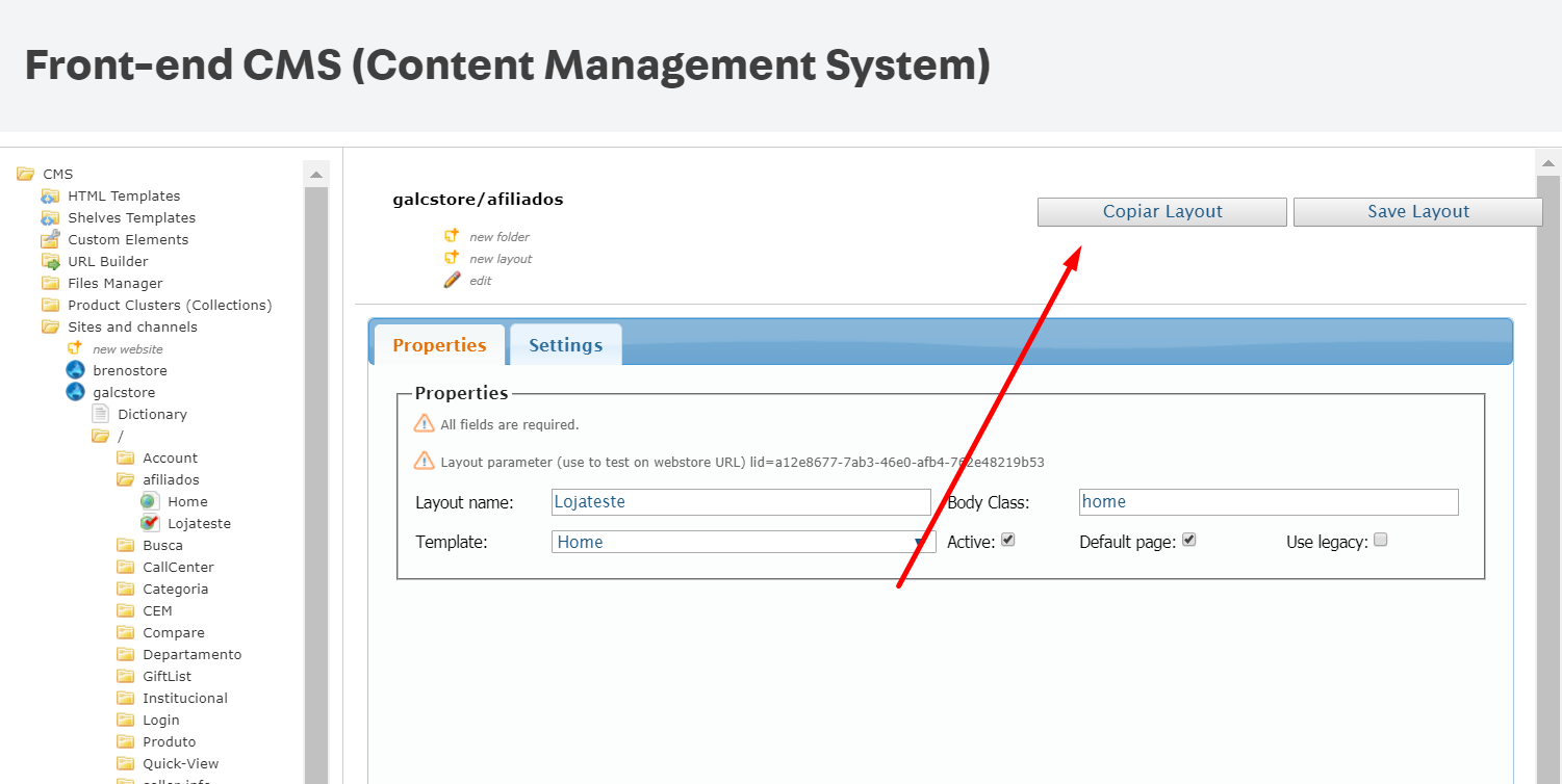 Si usted tiene más de un web site en su tienda y desea copiar un layout de uno de ellos a otro, puede hacerlo utilizando el botón Copiar Layout.