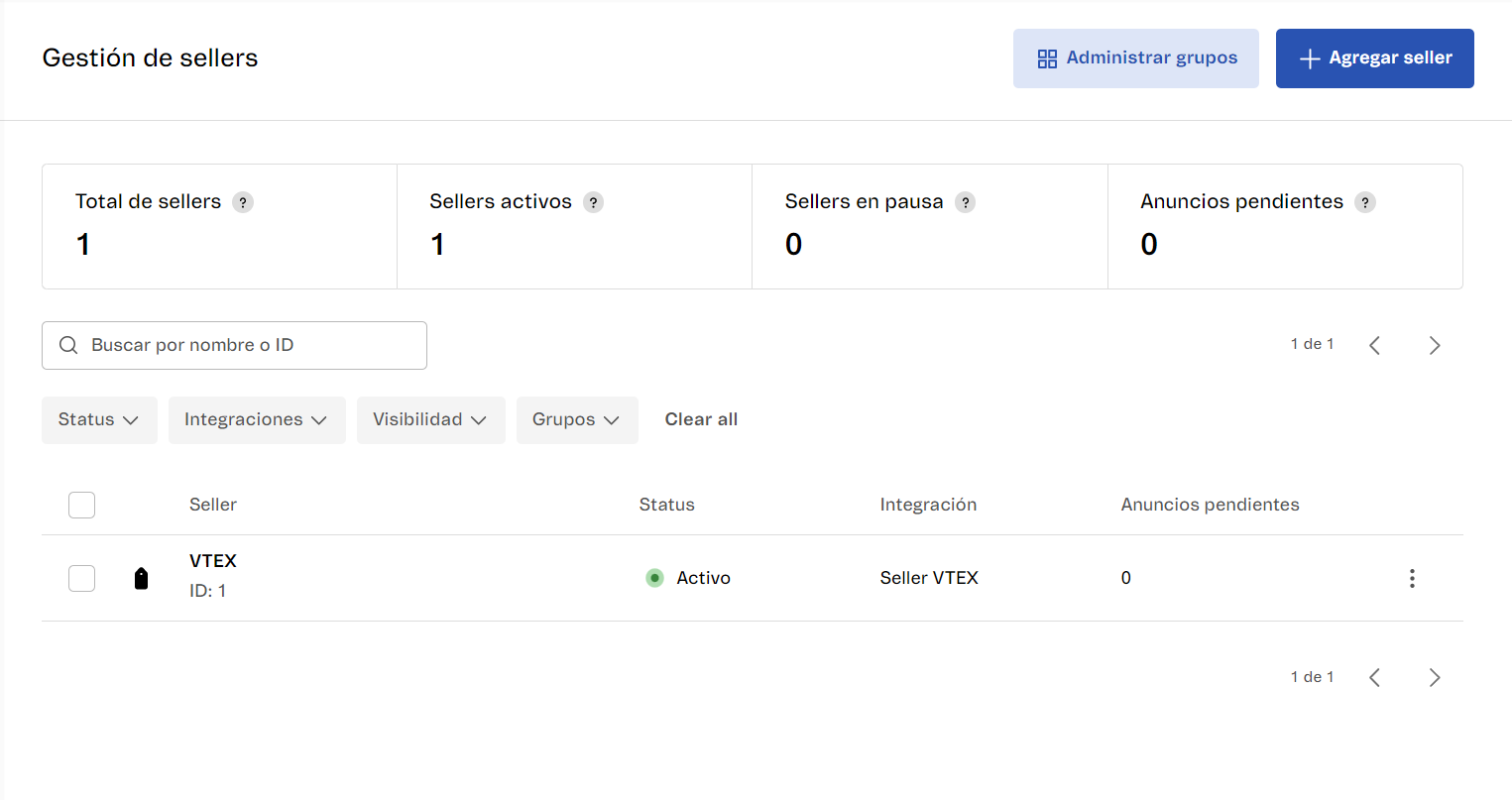 Gestión de sellers es la página donde los operadores del marketplace agregan sellers, registran su información y gestionan sus status. La página incluye métricas para que los marketplaces evalúen su operación. También pueden aplicar filtros a los resultados de la lista de sellers y agruparlos a través de la opción Grupos, tags que le permiten filtrar los resultados más fácilmente.