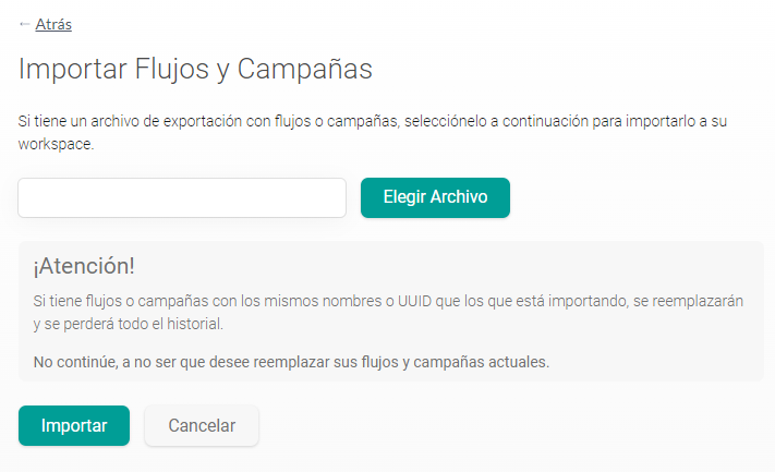 Para acceder a la página de importación de flujos, simplemente ve al menú de opciones y haz clic en el botón ""Importar"" en el módulo de Flujos.