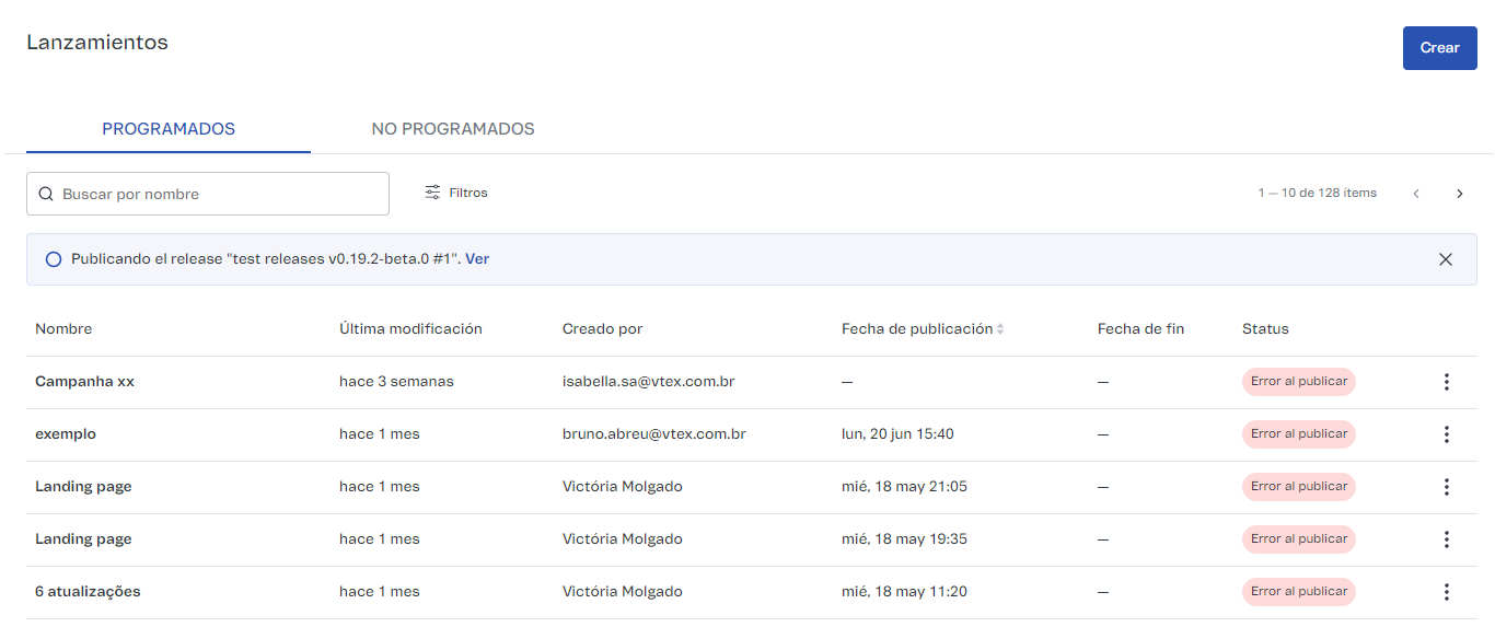 Todos los lanzamientos creados aparecen en una lista en el Admin VTEX en Configuración de la tienda > Lanzamientos. La página muestra dos pestañas, PROGRAMADOS y NO PROGRAMADOS, dependiendo de si el lanzamiento se creó con una fecha de publicación o no.