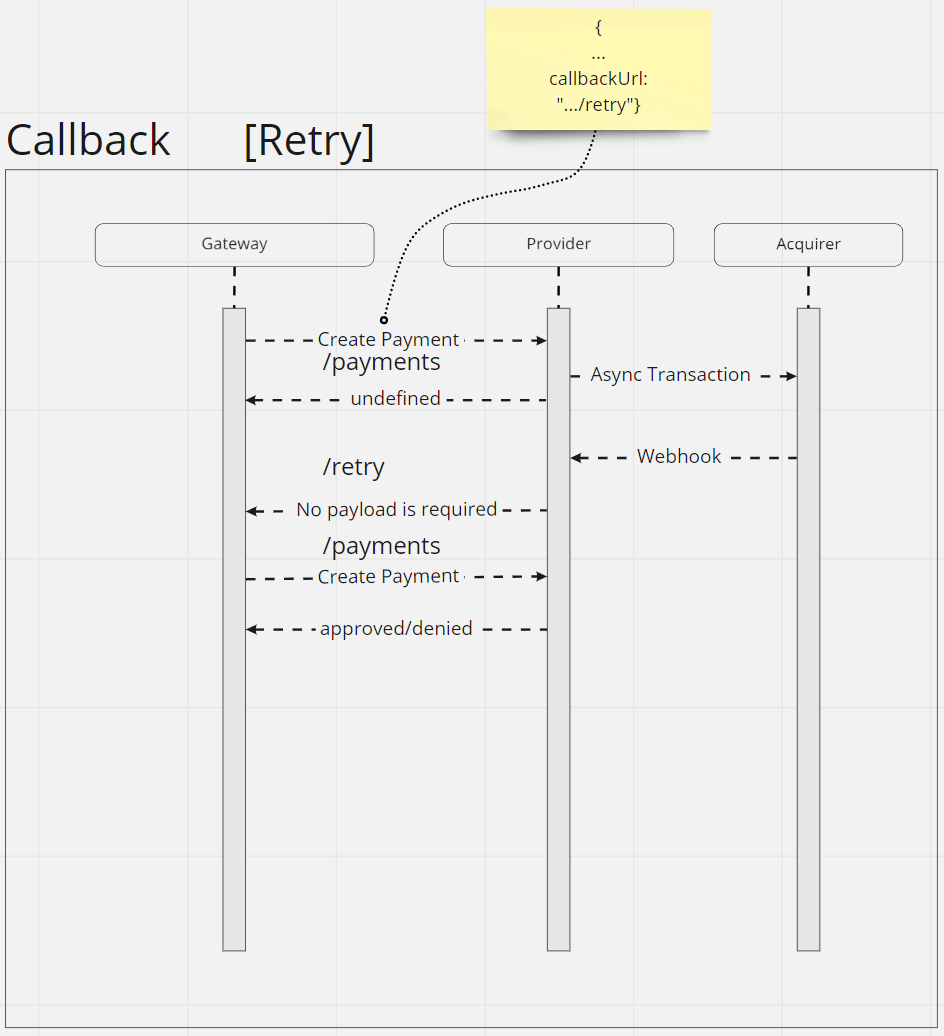 4. El proveedor, al recibir el pedido por webhook, hace una llamada al endpoint retry para el gateway, indicándo le que llame de nuevo al endpoint /payment. El retry no requiere ninguna carga.