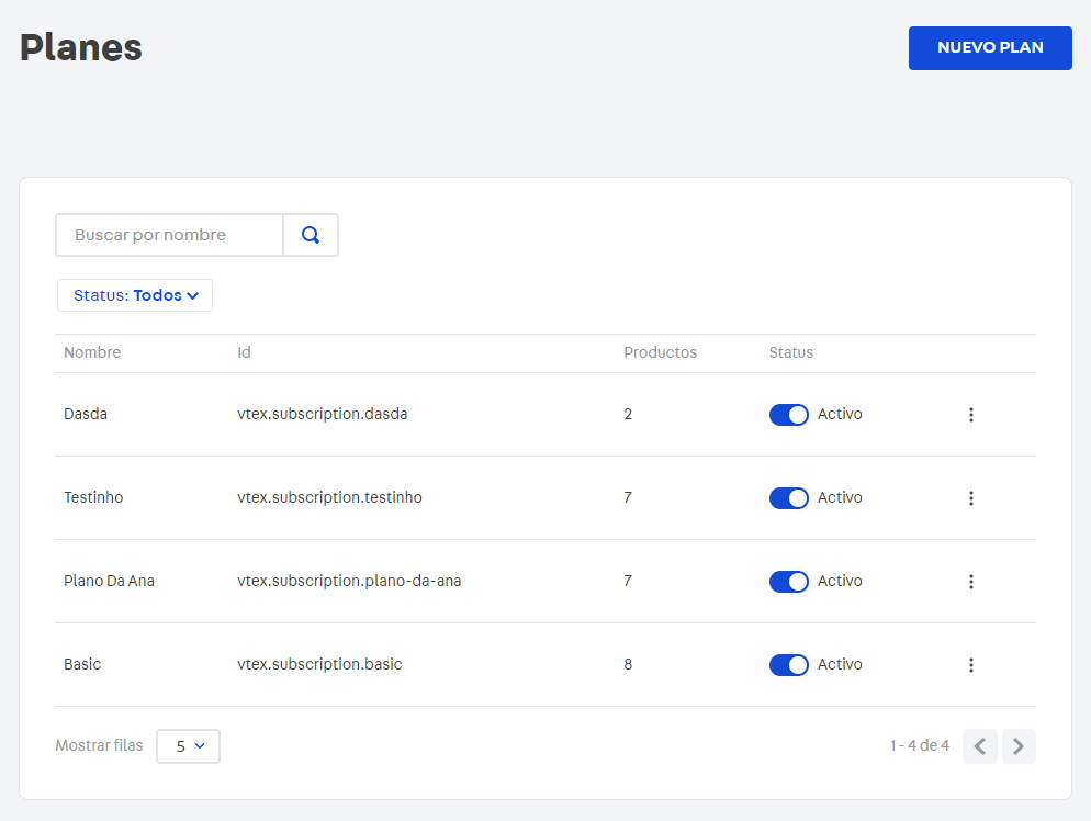 vtex.subscription.{nombre}. El ID se genera automáticamente al rellenar el nombre del plan en la página de creación de planes de suscripción y equivale al nombre del anexo de suscripción cuando se configura manualmente. Este campo no se puede modificar. - Productos: muestra la cantidad de productos asociados al plan de suscripción, es decir, el número de productos de su catálogo que ofrecen la opción de suscripción en el momento en que el cliente de la tienda pasa a finalizar la compra o crea una suscripción a través de Mi Cuenta, independientemente de la cantidad de SKU de cada producto.