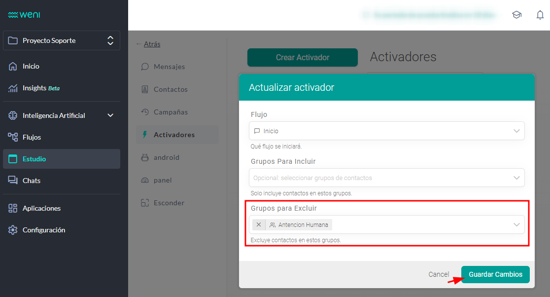 Para ello, debes añadir este grupo a la lista de grupos ignorados para cada uno de los disparadores configurados en tu proyecto, como se ejemplifica en la imagen a continuación.