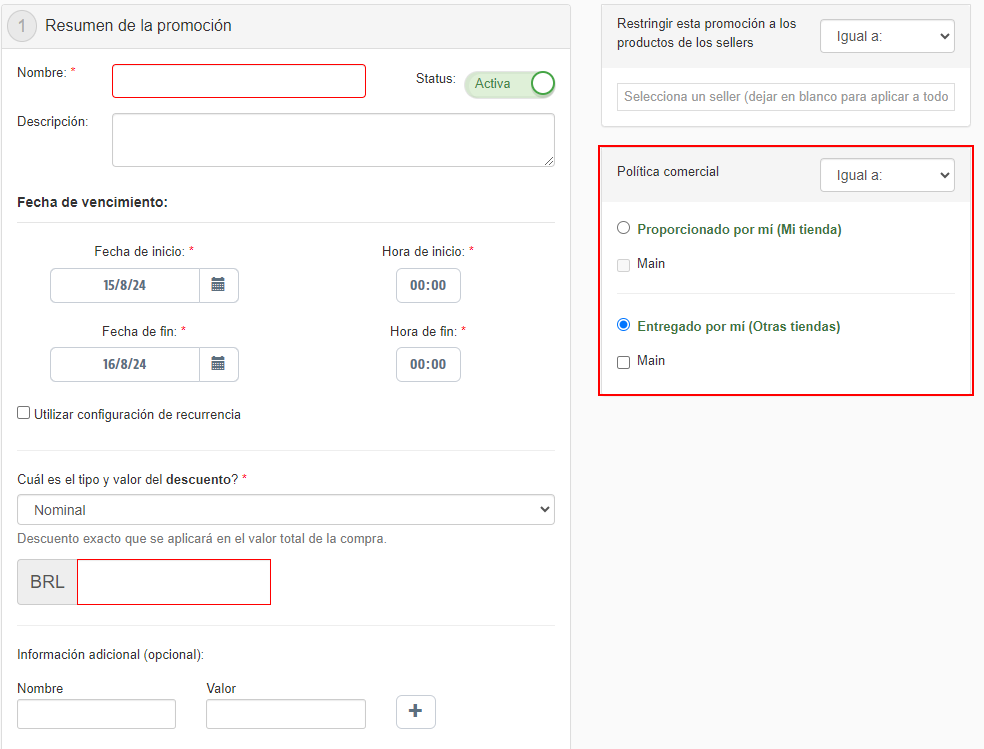 La política comercial define las reglas y condiciones de aplicación de las promociones en marketplaces. Es importante seleccionar la política comercial correcta para garantizar que la promoción se aplique según lo esperado. A continuación se indican los pasos a seguir para crear una promoción que contemple correctamente la política comercial.