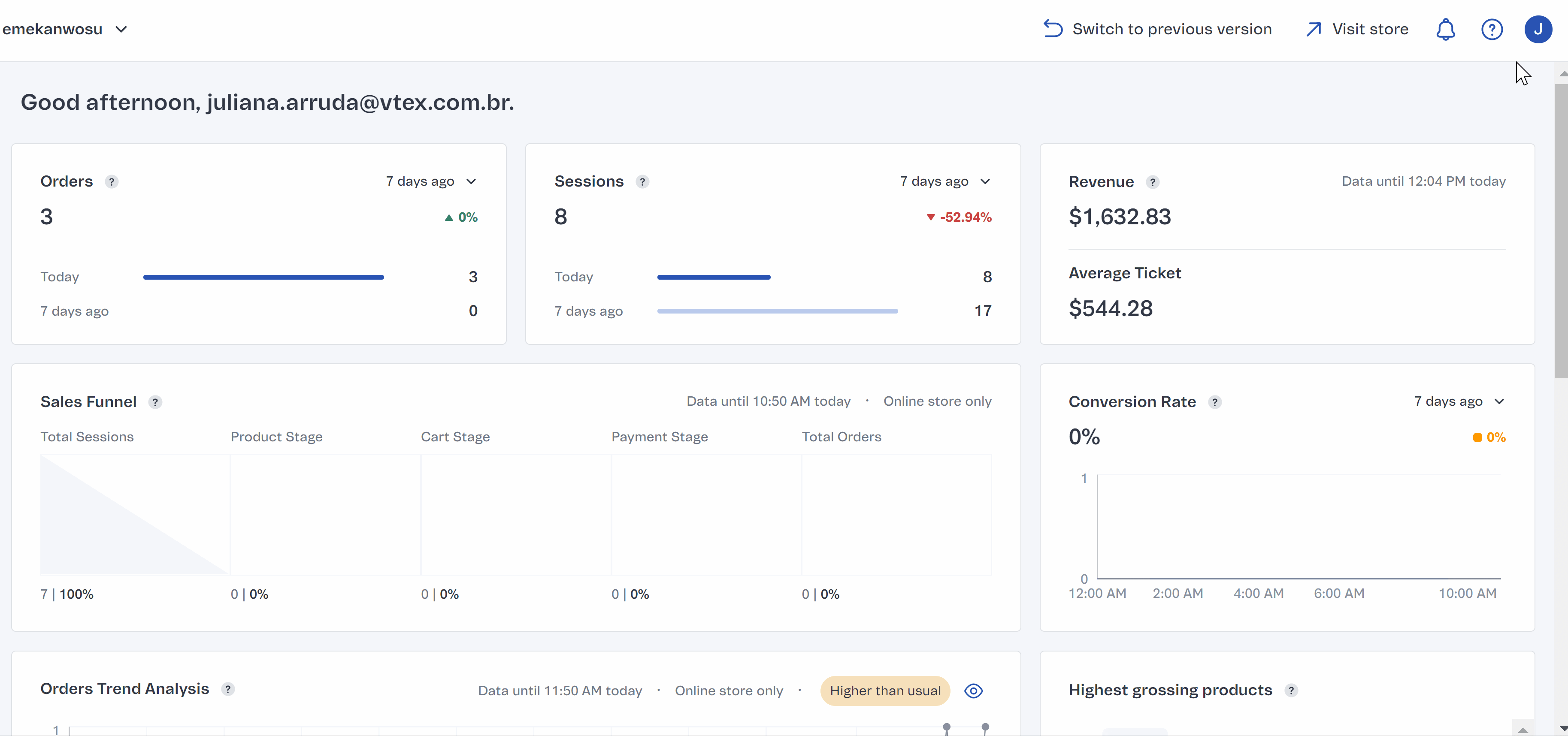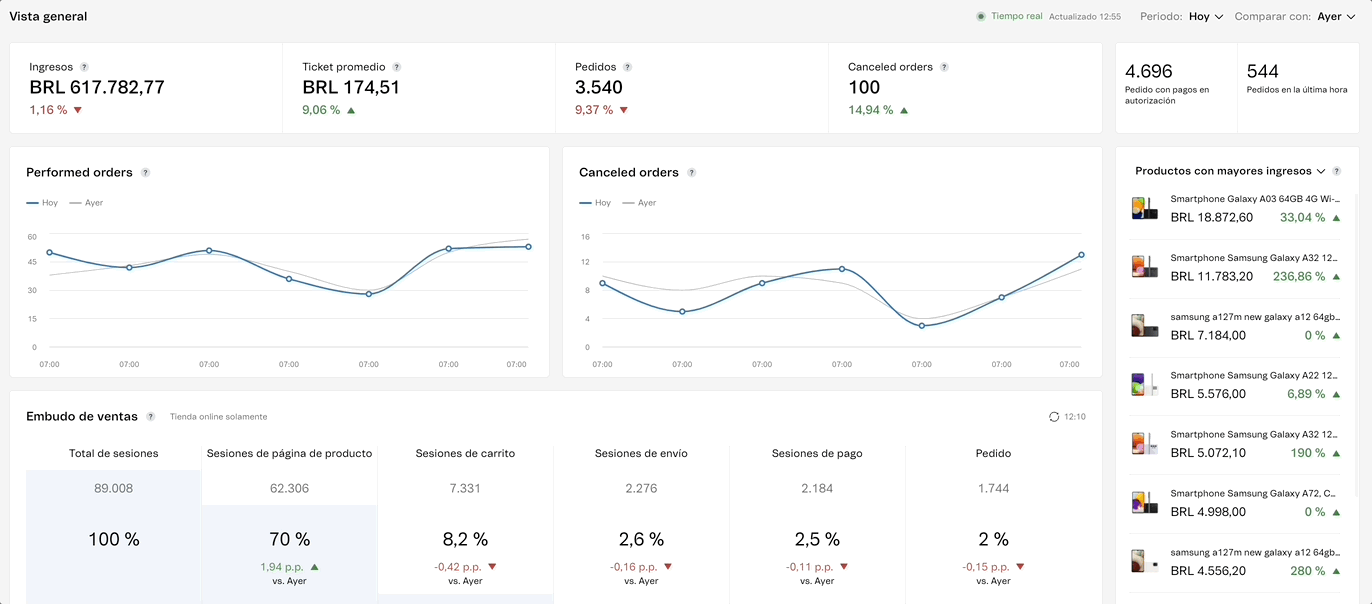 Una vez que accedas al Admin, verás métricas y gráficos útiles para monitorear el desempeño de tu tienda, como los ingresos generados y el número de pedidos, el embudo de ventas y la tasa de conversión, así como los 10 productos que más ingresos generan.