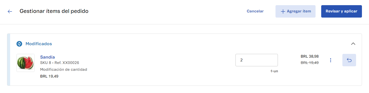 En la página Gestionar ítems del pedido, puedes deshacer las modificaciones si así lo deseas. Haz clic en el ícono de flecha curva Deshacer acción. Una vez hecho esto, aparecerá un mensaje de confirmación: "Modificación deshecha", y la acción se habrá revertido.