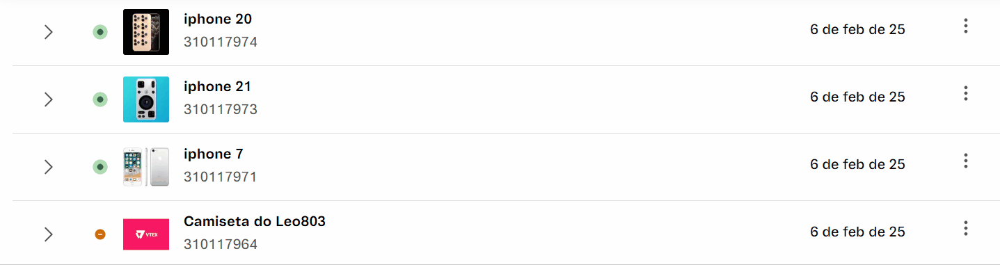 Al hacer clic en la flecha en la fila de un producto de la lista, la plataforma muestra una lista con todos los SKUs registrados para ese producto, según se ilustra a continuación: