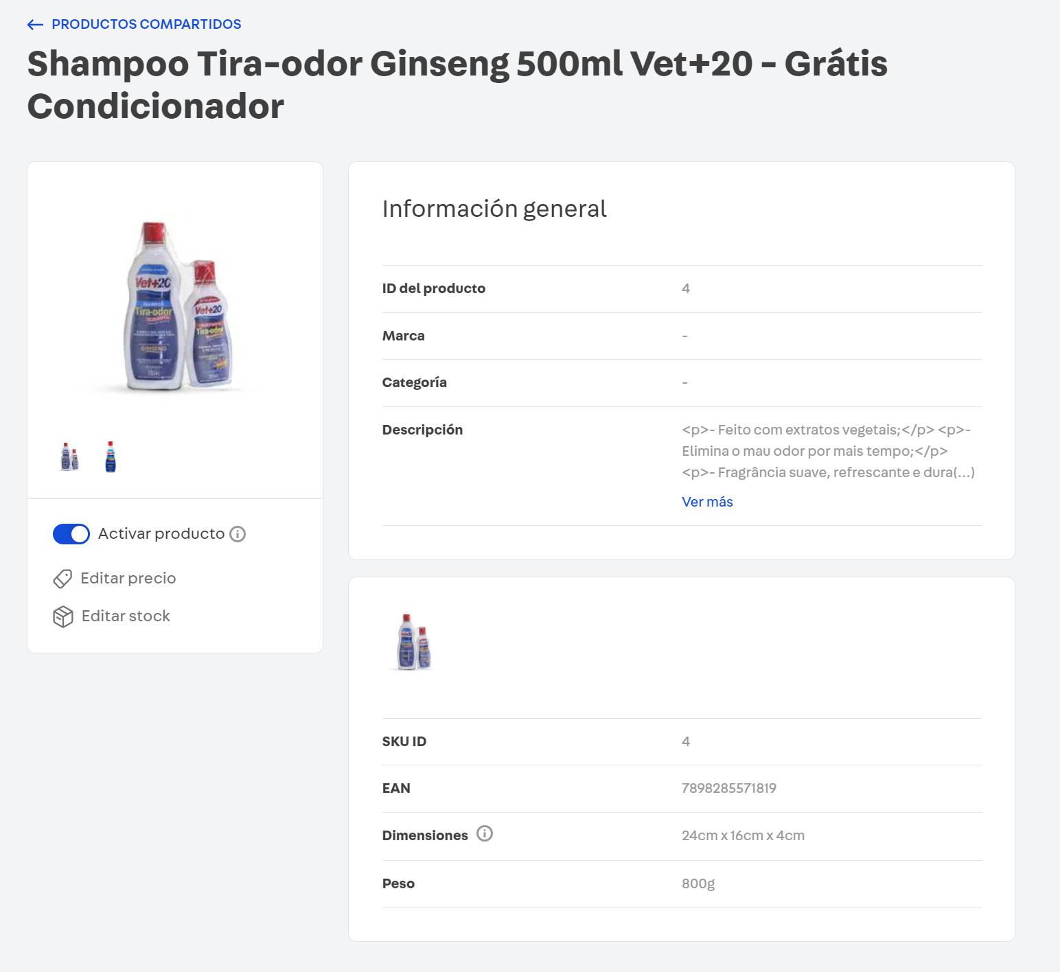 En la página «Detalles del producto» en la funcionalidad Produtos Compartidos se puede ver toda la información sobre un producto específico. A partir de ella el seller puede: