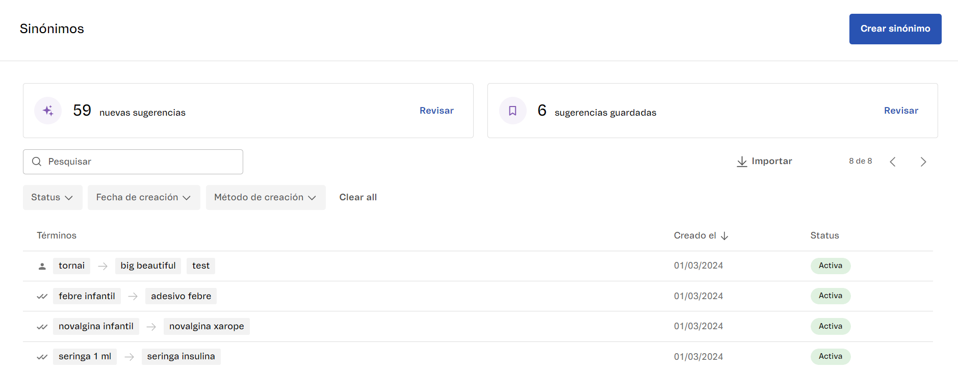 Después de revisar todas las sugerencias, cierra el modal para acceder a la lista de sinónimos configurada en tu tienda.