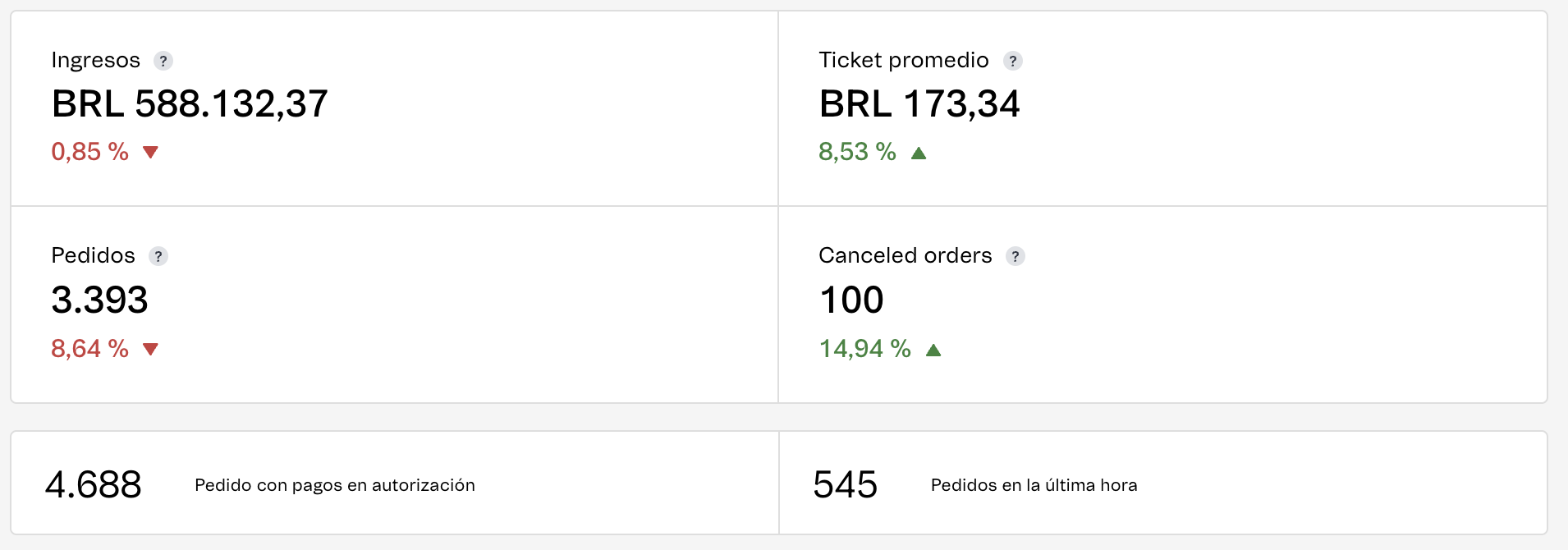 Pedidos con pago en autorizaciónPedidos que no se han realizado por problemas de autorización de pago. Al hacer clic en esta métrica, se te redirige a la página Transacciones para que revises las autorizaciones de pago pendientes.
