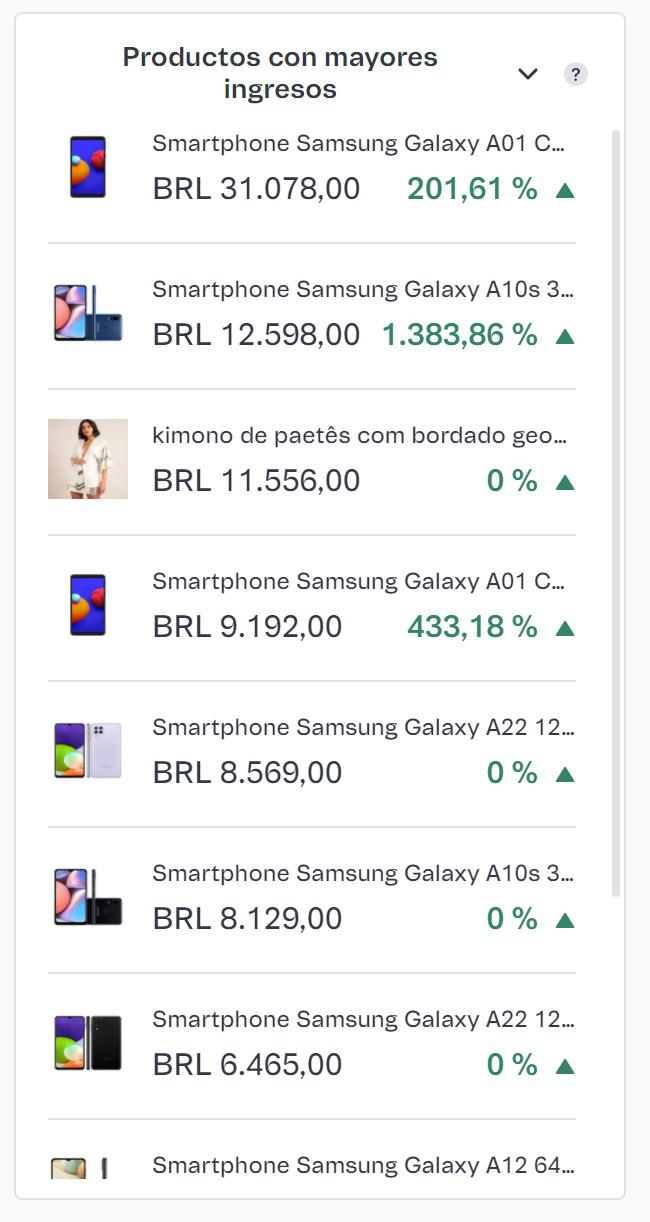• Productos con mayores ingresos: los productos que han generado los mayores ingresos en el periodo seleccionado. Indica el valor recibido en ingresos y un porcentaje que muestra el aumento o la disminución en los ingresos, comparando los periodos seleccionados.