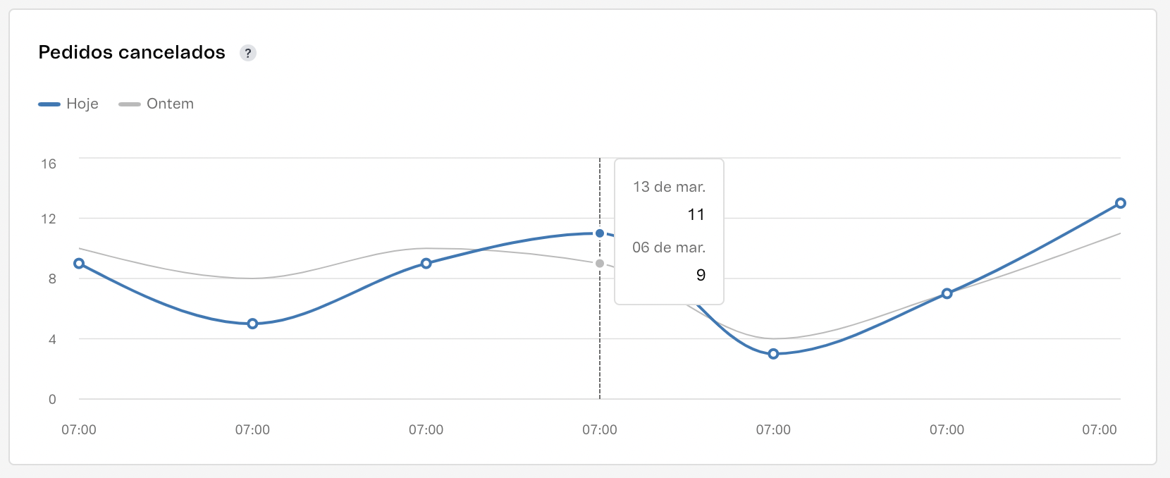 Este gráfico muestra el número de pedidos cancelados en la tienda en el periodo seleccionado. La línea azul más gruesa indica los pedidos cancelados en el periodo más reciente. La línea gris más delgada indica los pedidos cancelados en el periodo que estás comparando. Al pasar el mouse sobre las líneas, el gráfico muestra el número de pedidos cancelados en cada fecha.