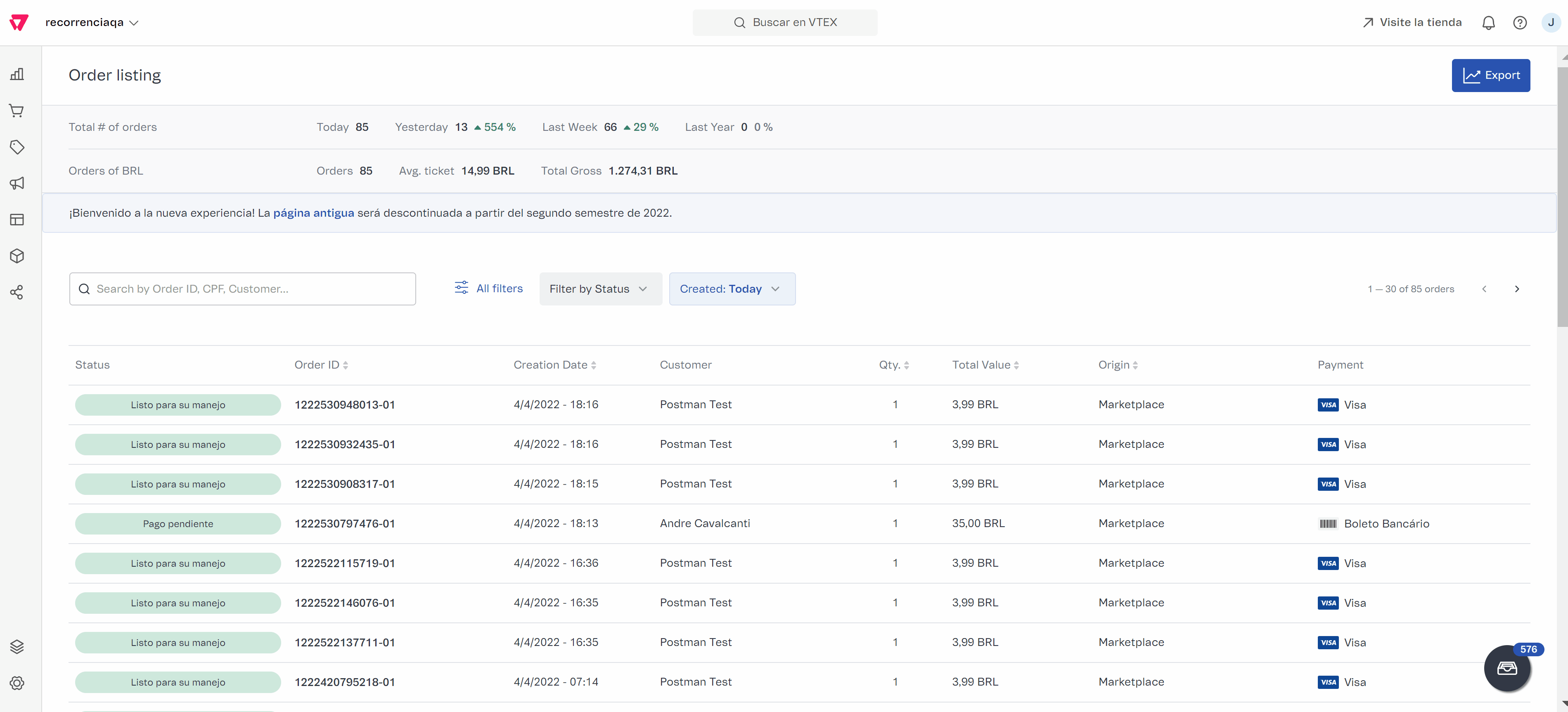 - En el Admin VTEX, accede a Pedidos > Todos los pedidos, o escribe Todos los pedidos en la barra de búsqueda en la parte superior de la página.