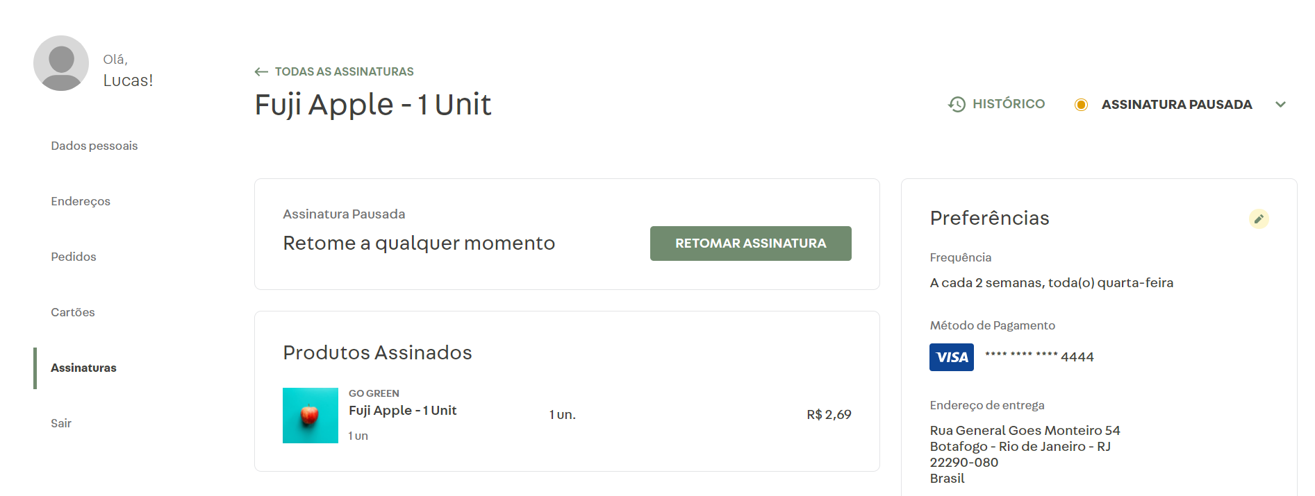 A melhoria do sistema de assinaturas também trouxe novas funcionalidades para o consumidor final da sua loja. A interface da página Minha Conta que os consumidores acessam no site da sua loja também evoluiu para comportar as seguintes funcionalidades: