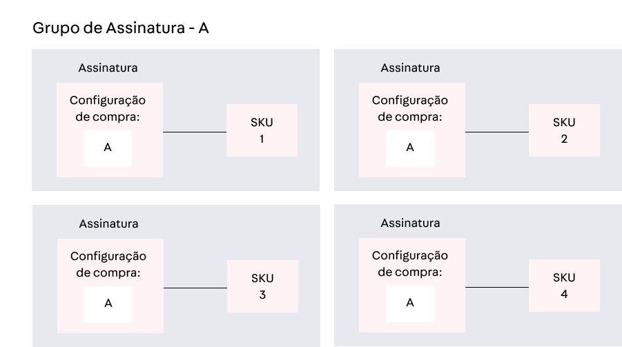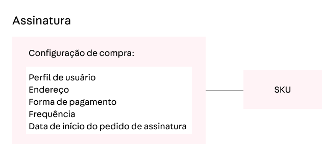 A assinatura para nós agora consiste em uma lista de SKUs e uma determinada configuração de compra. Isso significa que nós retiramos o conceito de Grupos de Assinatura do nosso sistema. Saiba mais no artigo Como funciona a assinatura. O diagrama abaixo demonstra o novo conceito de assinatura: