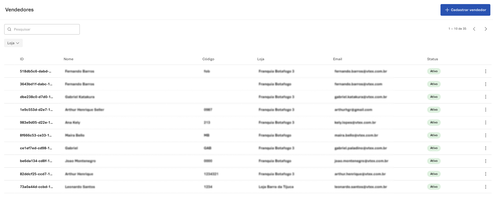 Após realizar as configurações básicas do VTEX Sales App no Admin, é possível adicionar novos vendedores ao sistema ou gerenciar os vendedores já cadastrados. A categoria Vendedores representa uma seção dentro das Configurações da loja do Admin VTEX, exibindo a lista completa dos vendedores registrados no aplicativo VTEX Sales App da loja. Dentro dessa página, é possível administrar as informações dos vendedores em todas as contas franquias da sua loja, realizando operações de cadastrar, buscar, filtrar, editar e excluir].