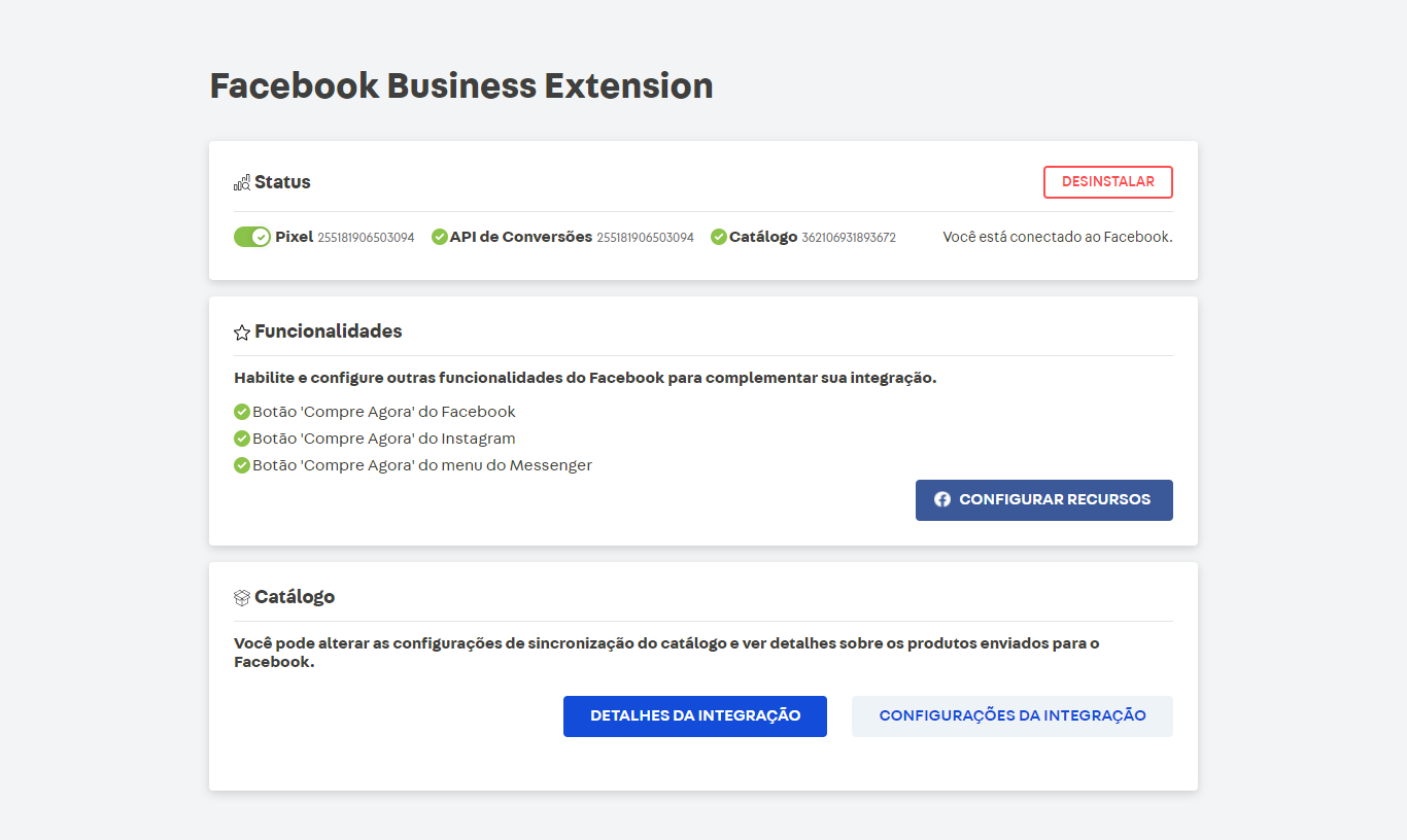 Esta é a seção na qual, além de você poder visualizar o status da sua conexão com o Facebook, são apresentados o ID do Pixel do Facebook e o ID do Catálogo. Nela existe também o botão Desinstalar.