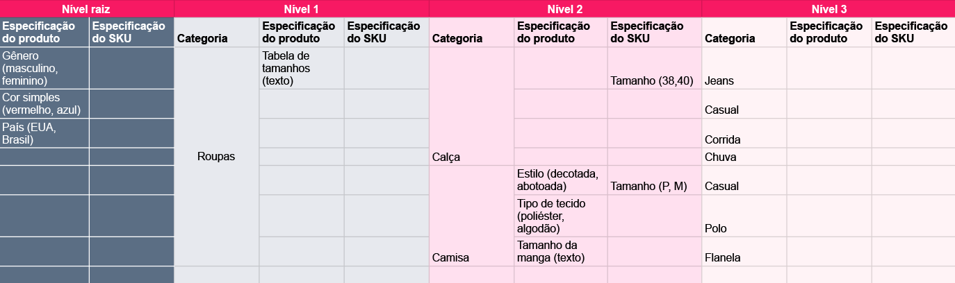 Antes de importar o catálogo da loja para a VTEX, recomendamos começar a trabalhar na árvore de categorias criando uma tabela como a ilustrada abaixo. Isto permite uma melhor visualização de como a árvore está organizada e como as especificações serão apresentadas.