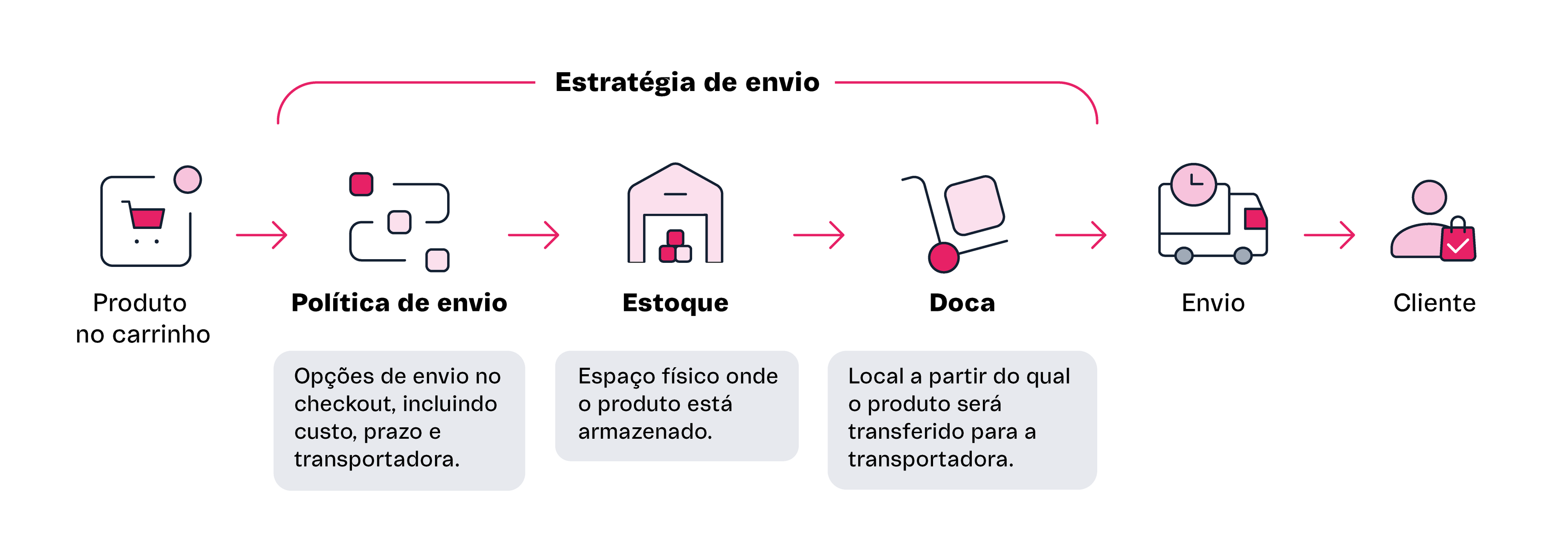 O conjunto de configurações essenciais de logística de uma loja VTEX é chamado de Estratégia de envio, composta de três conceitos principais: política de envio, estoque e doca.