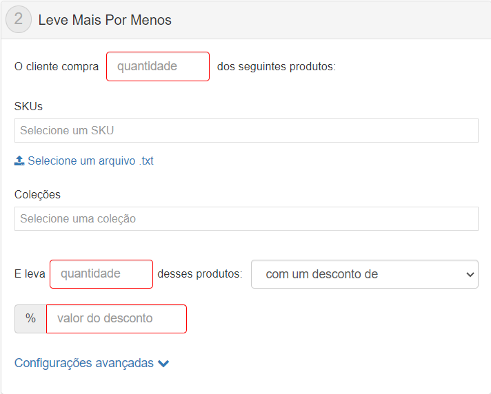 Na configuração da promoção Leve Mais por Menos, a loja deve definir a quais coleções ou SKUs ela será aplicada. Em seguida, escolha o número de itens no carrinho para ela funcionar e o número de itens com desconto.