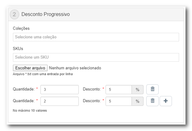 Na configuração da promoção de Desconto Progressivo, a loja deve definir a quais coleções ou SKUs ela será aplicada. Em seguida, escolha a primeira quantidade e o primeiro desconto aplicado. Por exemplo: para os primeiros 3 itens, o cliente receberá um desconto de 5%.