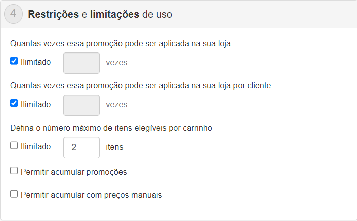 - Itens por carrinho: essa configuração limita a aplicação da promoção a um número de itens do carrinho. Assim que o limite for atingido, a promoção não será aplicada para o restante do carrinho. O sistema utiliza o preço como critério de escolha, dessa forma, os itens com preço menor serão os primeiros a serem afetados.