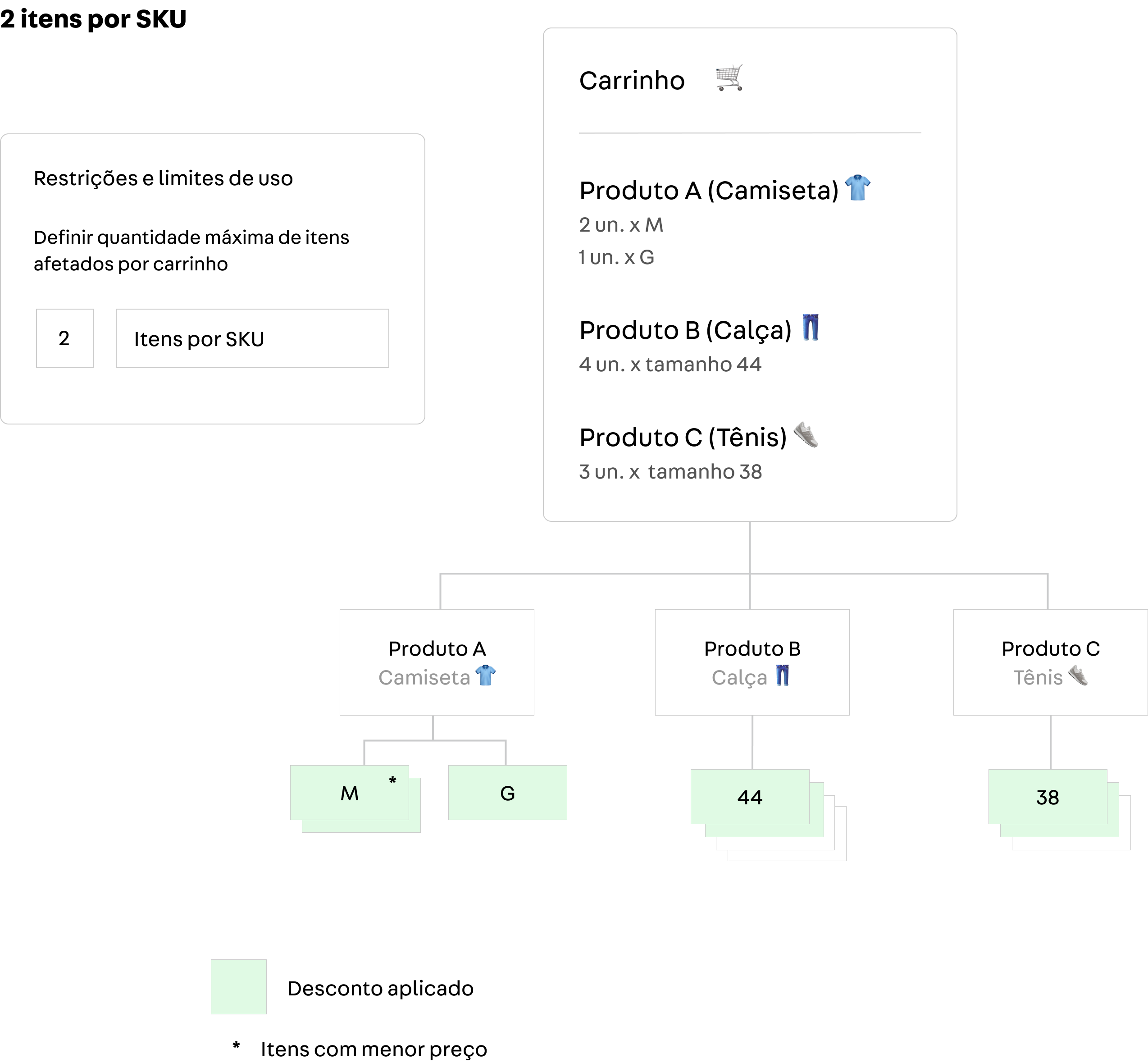- Itens por SKU: essa configuração limita a promoção a um número de unidades para cada SKU no carrinho. Como no exemplo abaixo, apenas duas unidades de cada SKU serão elegíveis para a promoção. Assim como no caso anterior, será o preço mais baixo que definirá os itens elegíveis para a promoção.