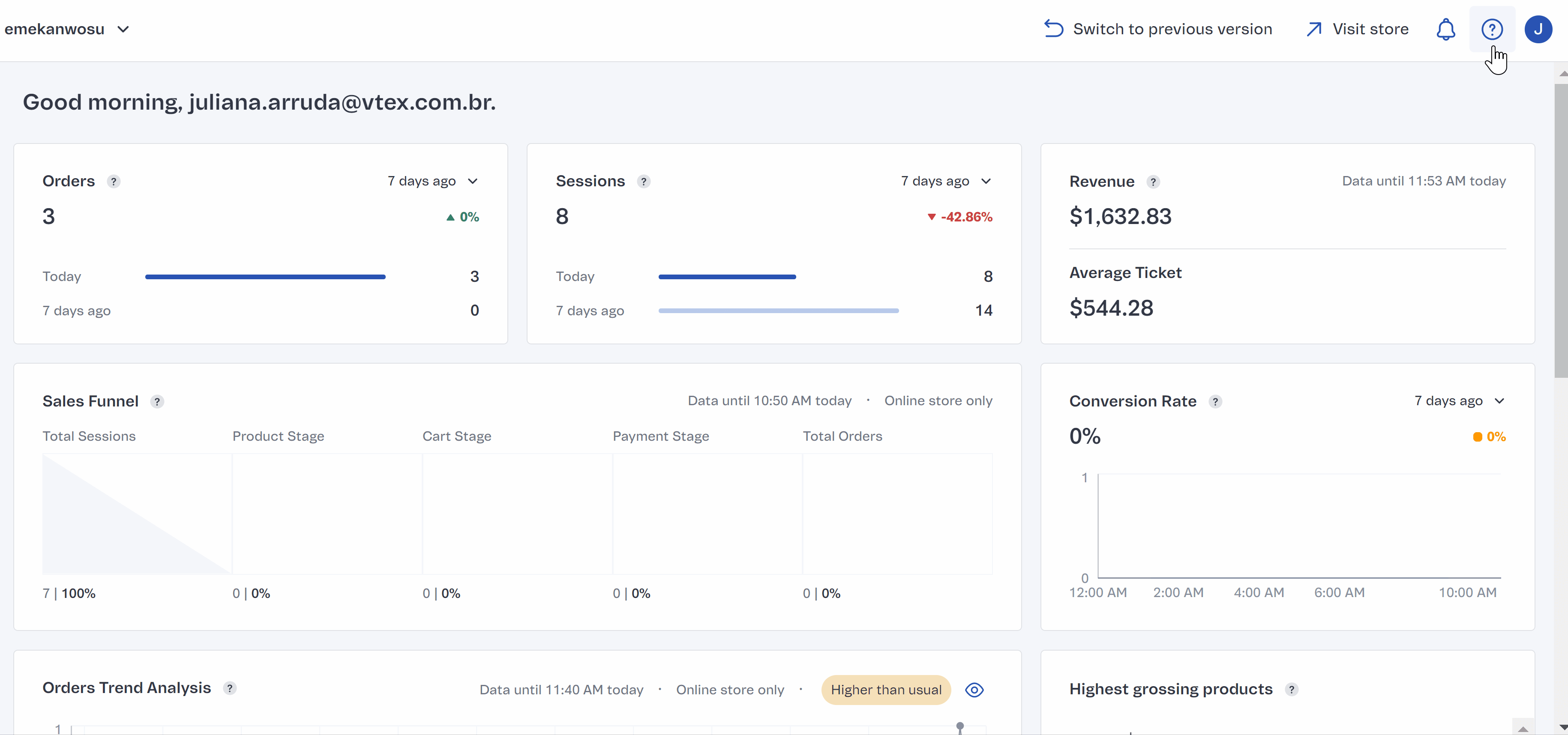 Assim que você fizer login no Admin, verá métricas e gráficos úteis para monitorar o desempenho da sua loja, como a receita gerada e o número de pedidos, o funil de vendas e a taxa de conversão, além dos 10 produtos que geram maior receita.