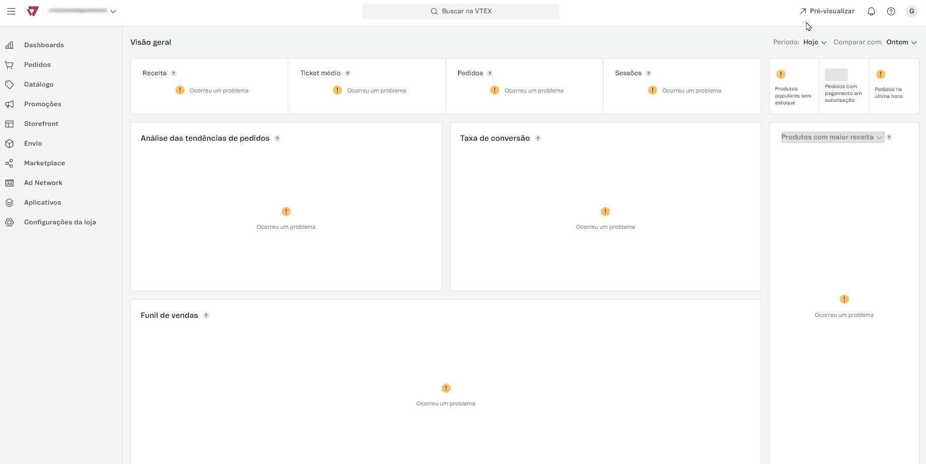 A página inicial oferece uma visão geral de alto nível da sua loja, como uma cabine de comando para as suas operações de comércio digital. Por isso, ela se chama Visão Geral.