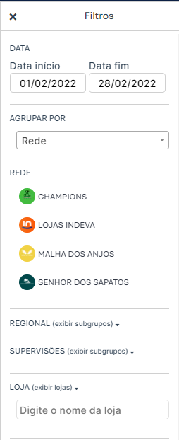 - Vendedores: filtro por rede, loja e, se disponível, subgrupos.