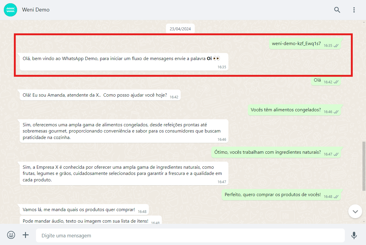 - Em seguida escolha entre ler o QR Code, copiar o link ou abrir uma guia para ser redirecionado ao canal de demonstração da Weni no WhatsApp. Envie seu token e você já pode começar a conversar!