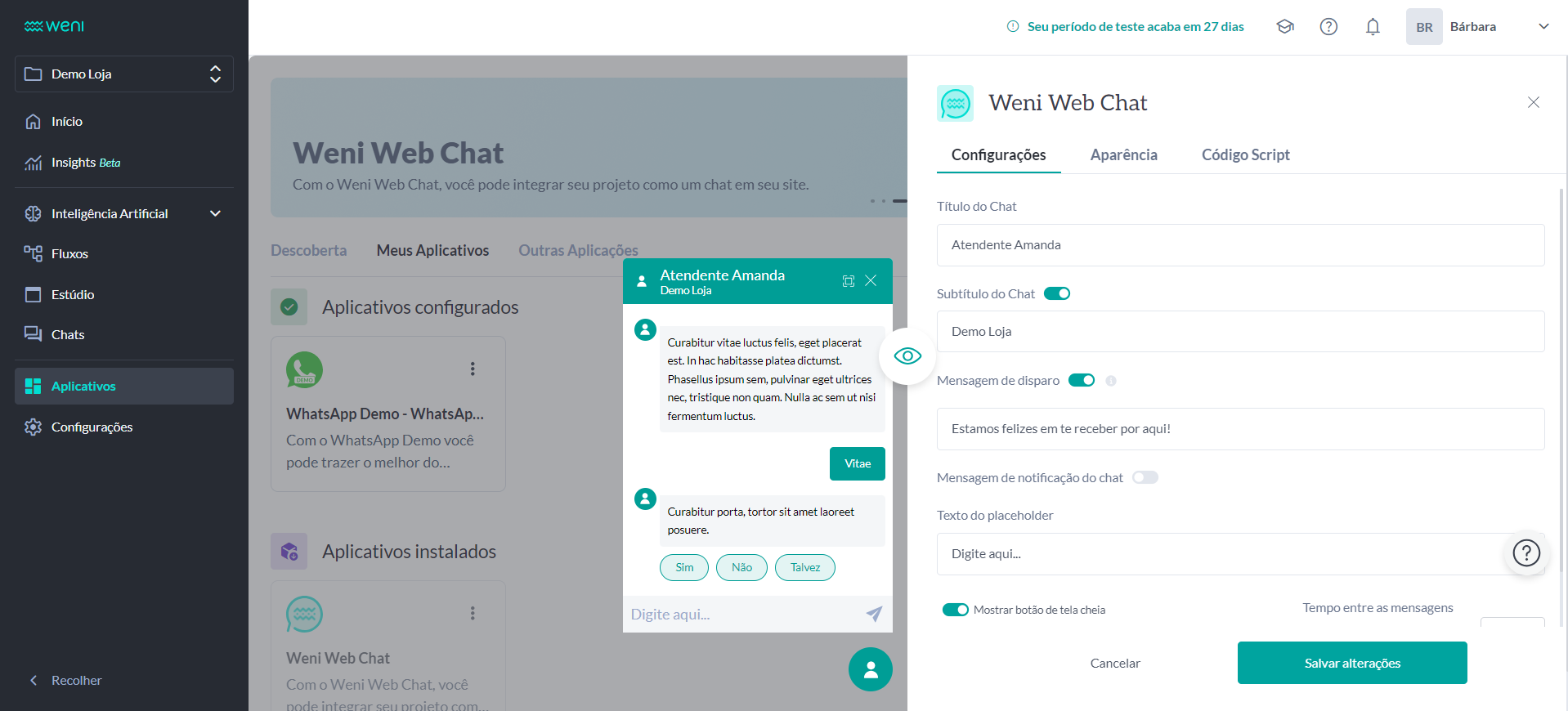 - Ao clicar em Aplicativos > Descoberta, você seleciona a opção Weni Web Chat.