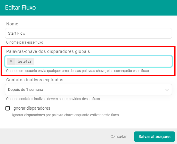 Na palavra-chave você definirá a palavra que funcionará como gatilho.Não utilize nomes comuns como: ajuda, olá, boa tarde. Utilize: teste123, ajuda123. Dessa forma irá garantir que se o usuário utilizar qualquer nome comum em uma mensagem, o fluxo com este disparador não será acionado.