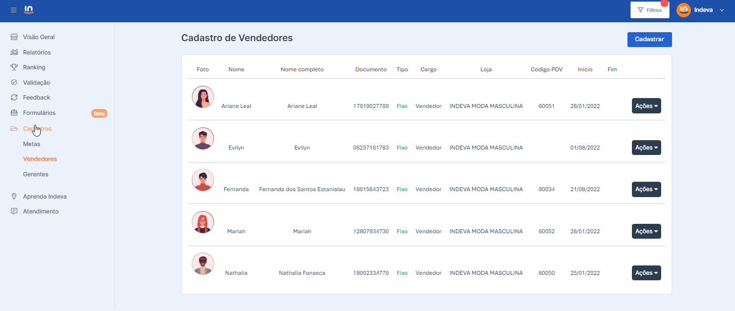 Enquanto o vendedor não estiver com o código informado corretamente, as vendas serão agrupadas na Indeva como Outras Vendas. Para corrigir registros anteriores, acesse Validação e refaça a validação dos dias impactados.
