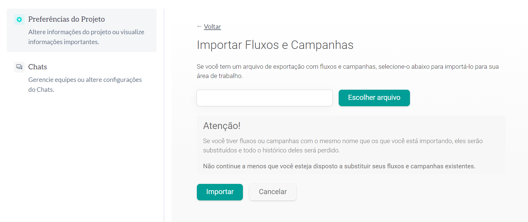 Para chegarmos na página de importação de fluxo basta ir ao menu de opções e clicar no botão importar nas configurações gerais da organização.