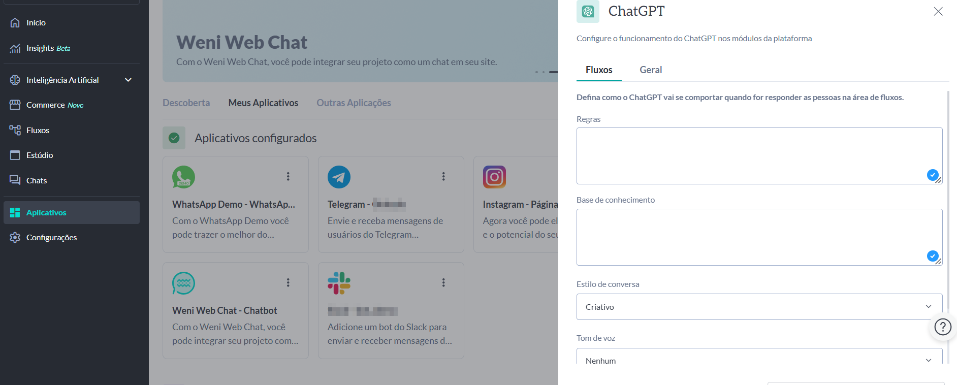 Após concluir os passos acima é necessário configurar o funcionamento do ChatGPT na aba Meus aplicativos. Dessa maneira nessa etapa é preciso definir como o ChatGPT vai se comportar quando for responder as pessoas na área de fluxos.