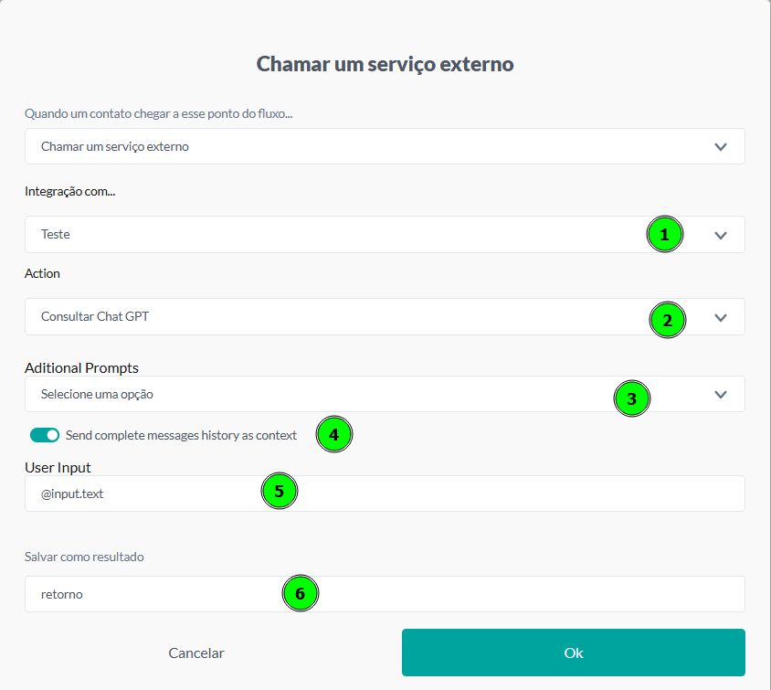 - Marcar um check se deseja enviar o histórico das mensagens do usuário com o bot na requisição;