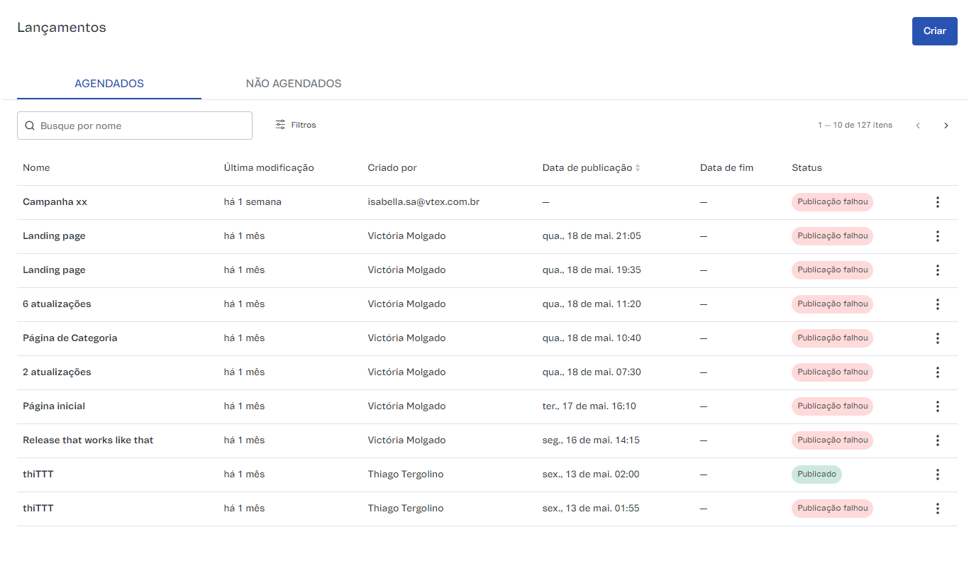 StatusExistem cinco status possíveis para um lançamento: Agendado: existe uma data definida para o lançamento ser publicado.Em fila: significa que a publicação do lançamento está em etapa de implantação. Nenhuma ação é necessária para que o lançamento passe para o status seguinte Publicando.Publicando: a plataforma VTEX está processando a solicitação de publicação do lançamento.Publicado: o conteúdo associado ao lançamento está publicado e é visível no storefront da loja para o consumidor.Publicação falhou: ocorreu um erro e o lançamento não foi publicado. Ao clicar sobre o nome do lançamento, uma página de detalhes do lançamento é apresentada, com mais informações sobre o tipo de erro e como solucioná-lo.