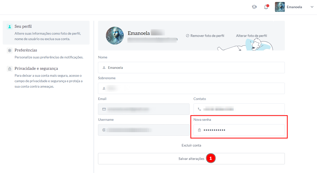 Clicando no ícone à esquerda clique em Seu perfil, nessa sessão pode editar seu nome, sobrenome e o contato da sua conta, além de poder, trocar a senha, caso necessário. Poderá também colocar uma imagem para o seu perfil. Digite as alterações e clique em salvar alterações que as informações serão atualizadas.
