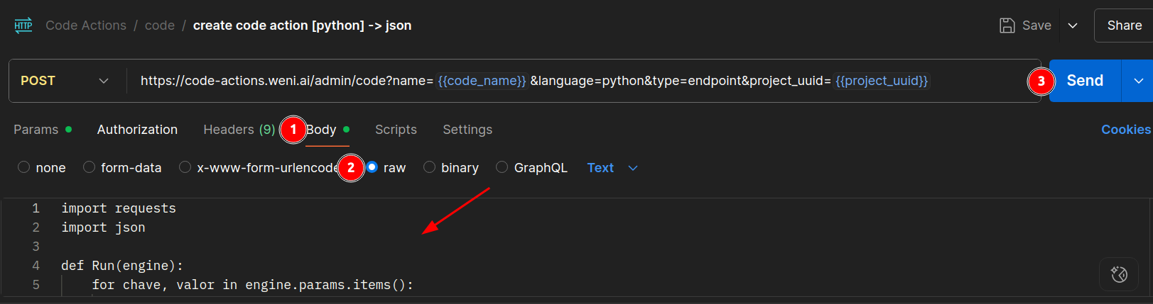 Para criar um código, como mostra na imagem acima, você precisará de alguns parâmetros como: project_uuid, code_name e Bearer Token.