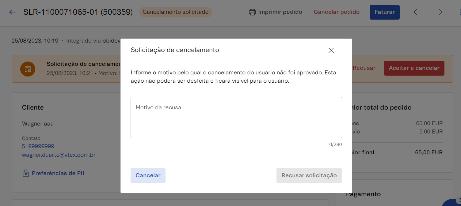 - Preencha o pop-up Solicitação de cancelamento com o motivo da recusa da solicitação de cancelamento do pedido.