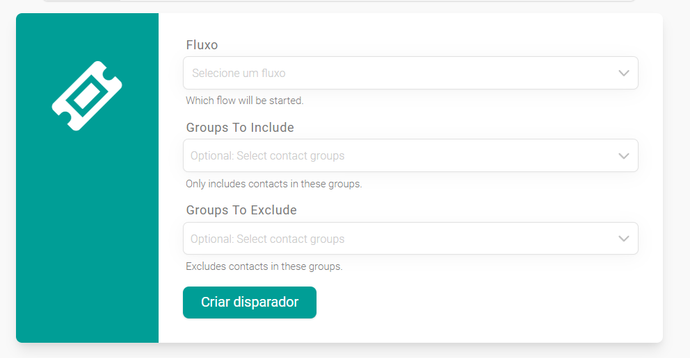 Escolha o fluxo que você deseja iniciar, para quais contatos ou grupos o fluxo será ou não transmitido.