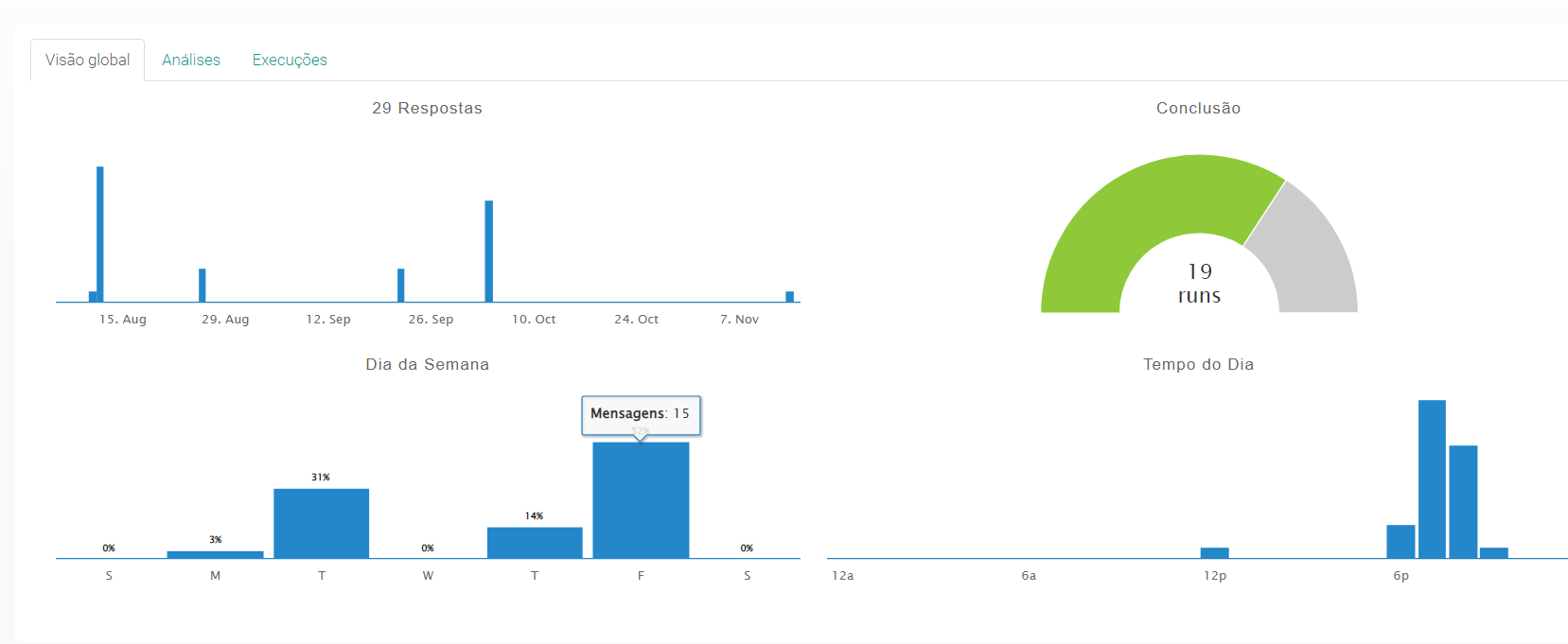 A aba de ""Runs"" oferece acesso a todos os dados brutos, que podem ser exportados e utilizados em outras aplicações para validação de informações. Na aba ""Execuções"", você pode optar por visualizar todos os dados ou apenas os contatos que responderam. Os resultados salvos nos cartões são exibidos em colunas.